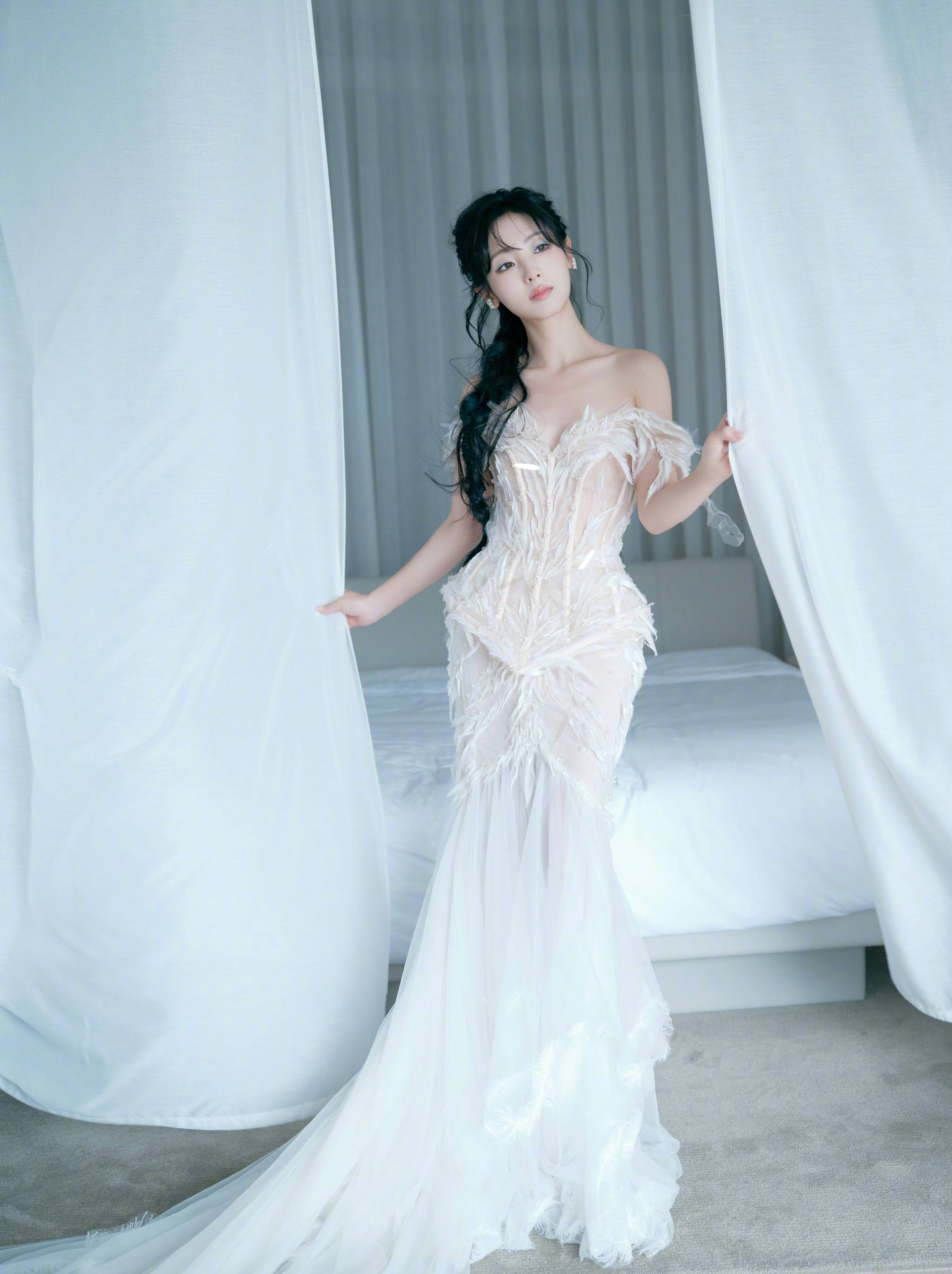 邢菲羽毛婚纱穿搭,灵动演绎婚纱梦幻叙事